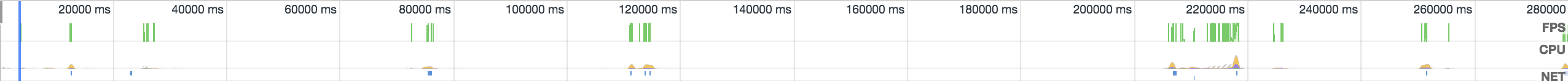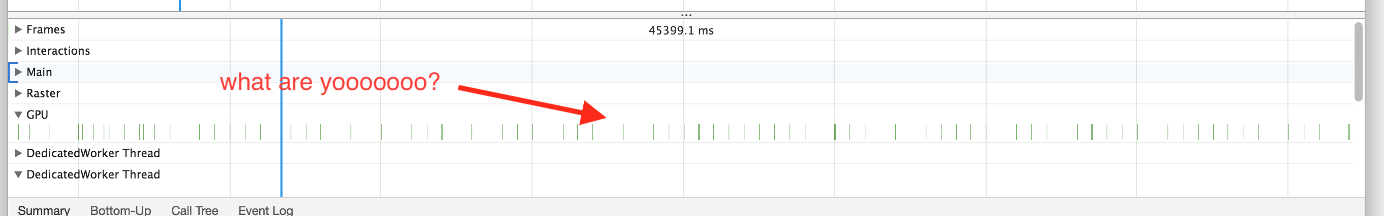 The frames list, which breaks down how long it took to draw each frame, shows some periods where it’s above 30fps (so it’s responsive) but then has some periods where it takes 30s - 90s (yep, seconds) to paint. I can’t see anything interesting in the main process flame graphs to indicate something is stealing CPU time (for example, Git operations) but the only thing I can see is GPU activity.